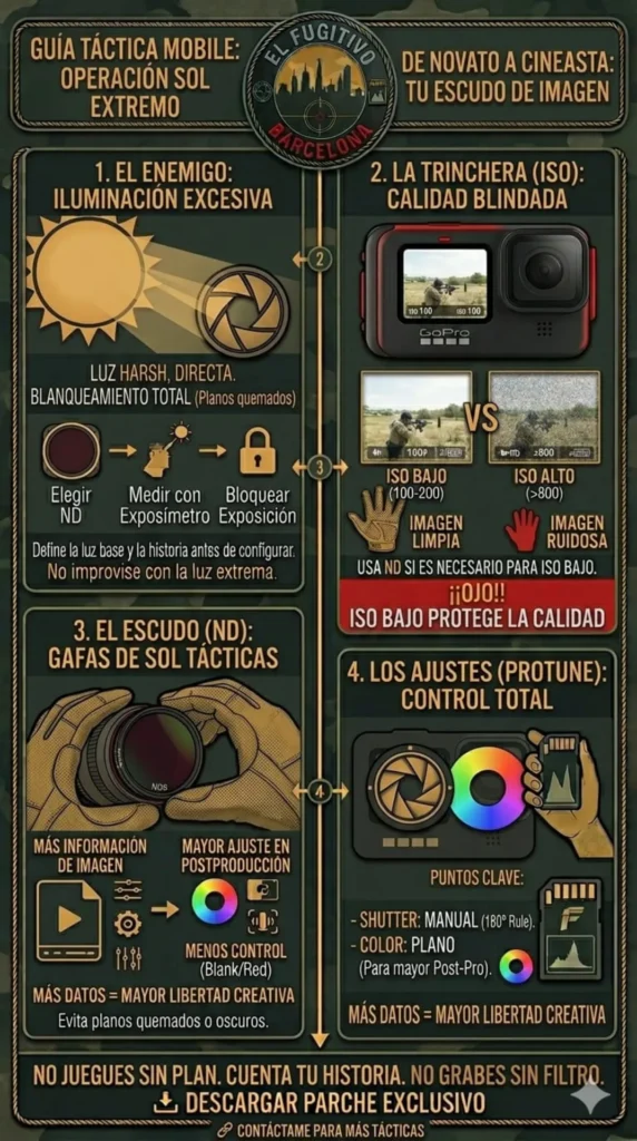 Ahora trabajo con un flujo claro que me permite controlar la luz desde la cámara. No dependo del azar. Ajusto exposición, configuro Protune y uso filtro ND cuando hace falta (solo en el drone). Aquí explico cómo lo hago paso a paso para lograr una imagen limpia y usable y evitar imagenes quemadas.