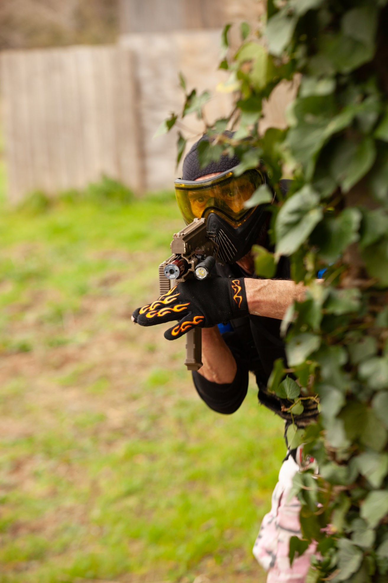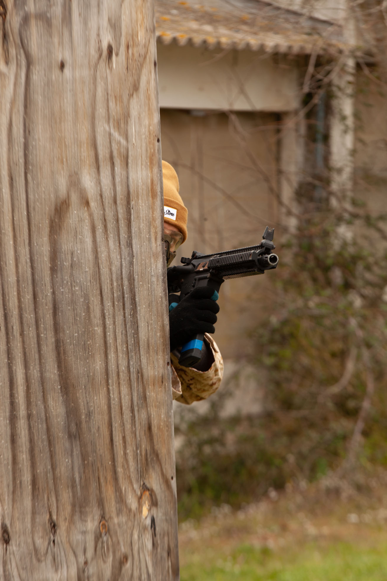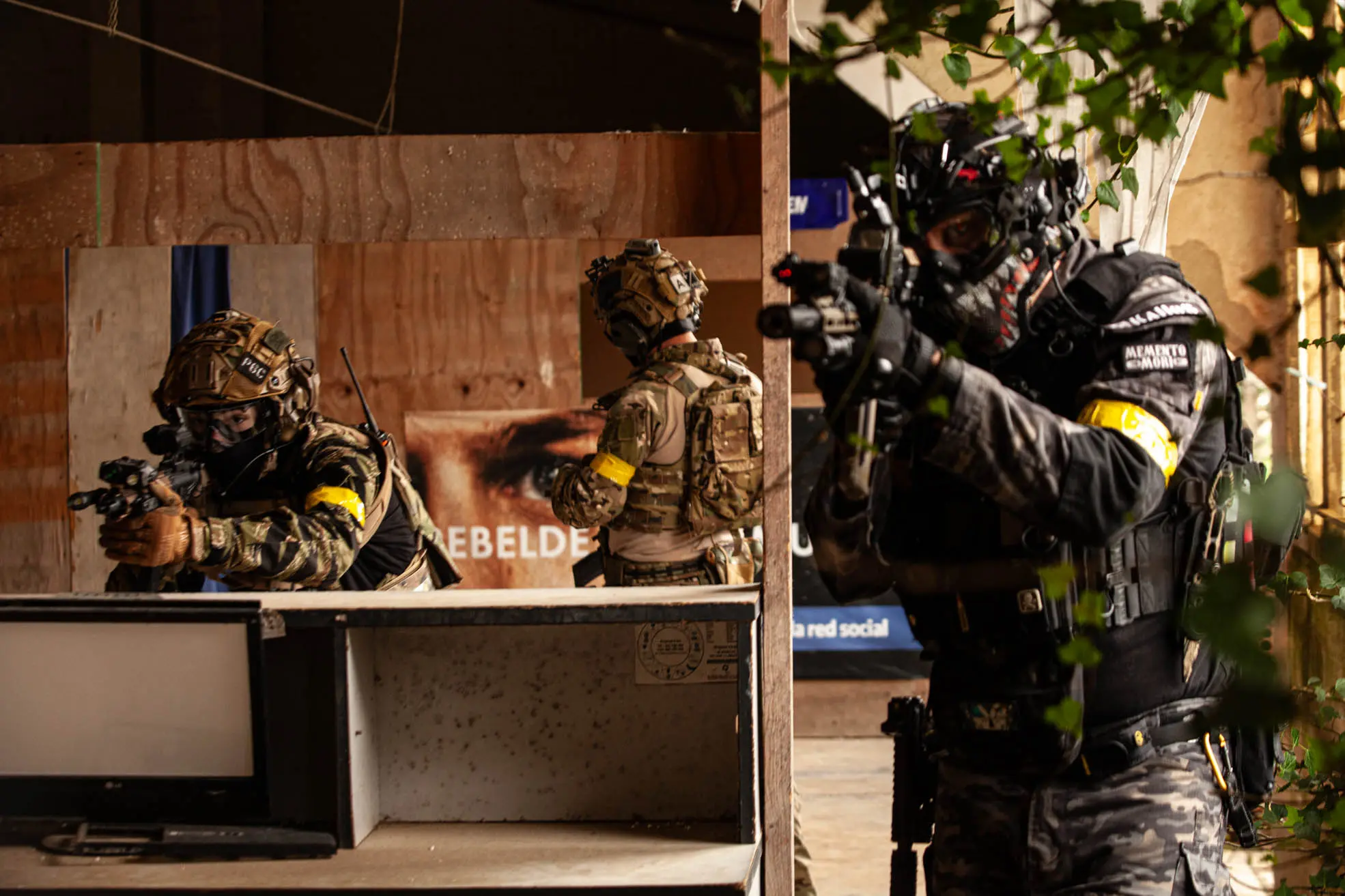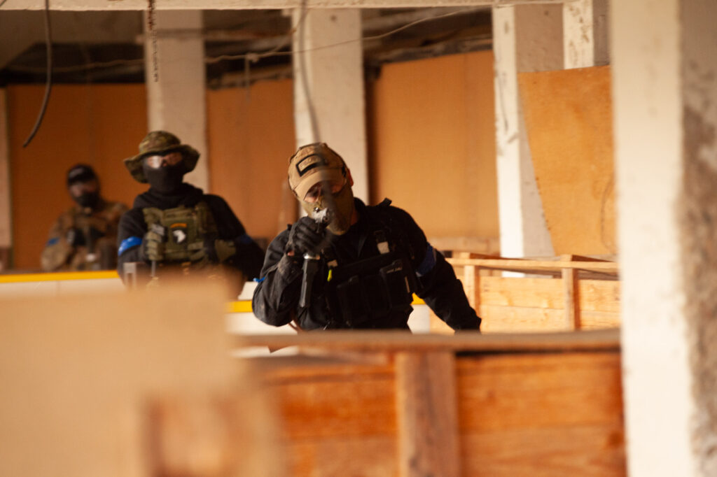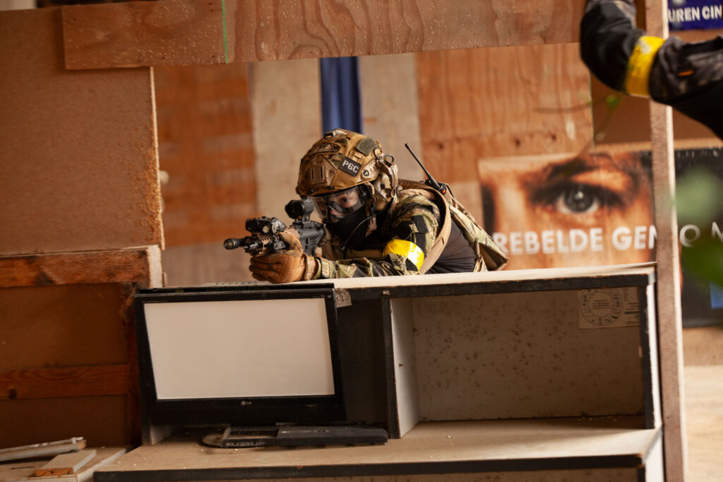 Lo interesante fue ver cómo el equipo mantenía estructura en medio del intercambio. Cobertura cruzada, control de flancos y comunicación clara. Desde la cámara se percibe el ruido, la adrenalina y el movimiento, pero también se nota el orden detrás del avance, pude disparar con velocidades lentas para lograr buenos barridos.